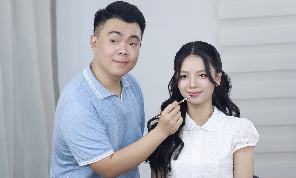 Chuyên gia trang điểm Lường Đình Điệp cho biết, để phù hợp tính chất công việc của diễn viên Hạ Anh 'Mưa đỏ', anh chú trọng lớp nền nhẹ nhàng mà vẫn bền cho cô.